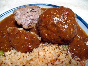Para preparar las albóndigas se hace un picadillo con las carnes, 1 cebolla, 1 diente de ajo, el perejil picado, los 2 huevos, un chorrito de leche y pan rallado. Se envuelven en harina, se fríen y se reservan. En una sartén se prepara la salsa de cinco verduras: 1 pimiento rojo, 1 cebolla, 1 zanahoria y 2 dientes de ajo. Antes de añadir los 3 tomates pelados y limpios de pepitas se incorpora una cucharada de harina, vino blanco, sal y, ya con los tomates, una pizca de azúcar. Se dejan cocer todas las verduras 15 minutos y después se trituran y se cuelan. En la salsa resultante, que se condimenta con orégano al gusto, se cuecen las albóndigas de 20 a 25 minutos. Se sirven acompañadas de patatas fritas o de macarrones cocidos.