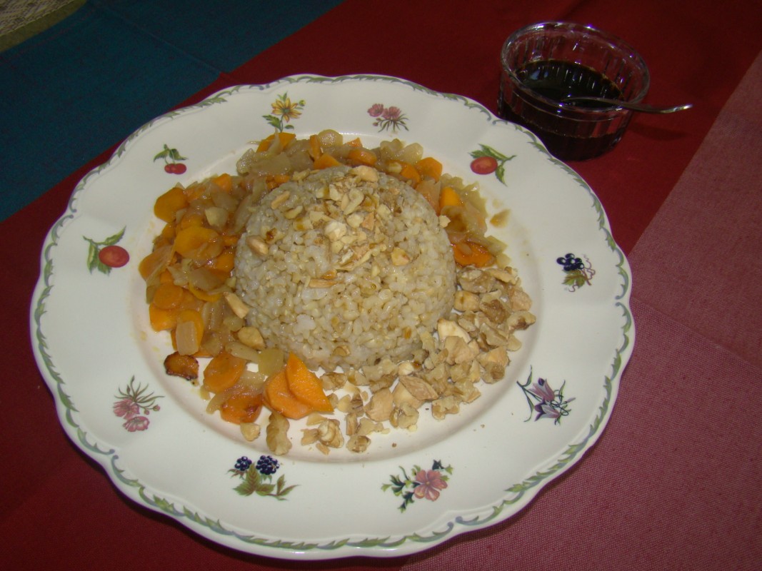 Preparar un arroz blanco sin sal al dente (granoso).Cortar las ciruelas pasas en trozos pequeños.