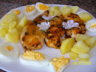 Ingredientes 1 kg. de bacalao 1/2 kg. de cachelos trozos de patata cocida 3 dientes de ajo 100 gr. de harina ó 8 huevos cocidos 1 cucharadita de café de pimentón dulce ó picante (según gustos) 250 cc. de aceite ó vinagre Preparacion La desalación del bacalao se realiza poniéndolo en remojo en agua fría y en sitio fresco durante 48 horas, cambiándole el agua cada ocho horas. En una sartén se calienta el aceite. El bacalao se trocea y se reboza en harina. Se fríe en el aceite bien caliente, primero del lado de la carne hasta que esté bien dorado y después se le da la vuelta y se fríe del lado de la piel. Cuando esté frito el bacalao se pasa todo a una cazuela de barro, se le añaden los cachelos previamente cocidos y los huevos duros troceados. Los ajos se trocean en láminas y en el aceite sobrante se doran. Cuando los ajos estén dorados se añade el pimentón y un chorrito de vinagre. Añadir al bacalao y calentar todo 2 minutos en el horno.