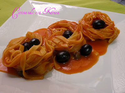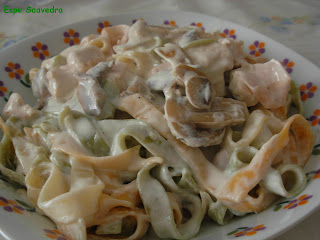 Ingredientes 300 g de cintas de colores 1 vasito de nata líquida 4 yemas Queso rallado Aceite de oliva Agua Sal Preparacion Se cuece la pasta con agua, sal y aceite de oliva. Se escurre y se saltea con aceite. Se baten las yemas y se mezclan con la nata. Agregar la pasta y remover. Retirar, y gratinar 3 minutos con queso rallado