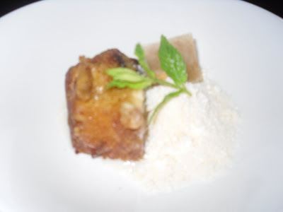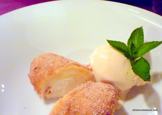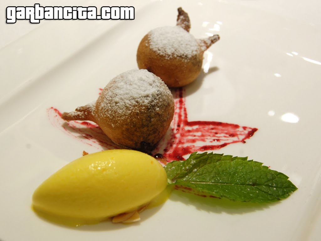 Ingredientes - Para la crema: 1/2 l. de leche, 2 cucharitas soperas de harina, 50 grs. de almendra molida, 50 grs. de azúcar, canela molida. - Para las torrijas: 8 rebanadas de pan pequeñas, 50 grs. de azúcar, azúcar glas, especias diversas (canela, vainilla, anises, pimienta negra...). - Para el helado: 1/4 l. de leche, 50 grs. de azúcar, 2 yemas de huevo, 100 grs. de frutas de Aragón. Preparacion - Para la crema: hervir unos 10 minutos la leche con la harina a fuego muy lento. Añadir, 5 minutos antes de finalizar la cocción, el azúcar. Dejar enfriar. - Para las torrijas: hervir la leche con el azúcar. Sacar dle fuego y añadir las especias. Tapar y dejar infusionar hasta enfriar. Colar. Echar esta leche sobre las rebanadas de pan, escurrir, pasar por huevo batido y freír en aceite. Espolvorear por encima con azúcar glas. - Para el helado: hervir la leche y echar sobre las yemas montadas con el azúcar. Pasteurizar al fuego (como una crema inglesa). Enfriar rápidamente y meter a la heladora. Agregar las frutas picadas muy finas casi al final. PRESENTACIÓN: En un plato hondo colocar un poco de crema y espolvorear con canela molida. Colocar las torrijas en el centro y encima una quenefa de helado. decorar con láminas crujientes de chocolate y na ramita de menta o albahaca. By JOSS Receta de Aragón