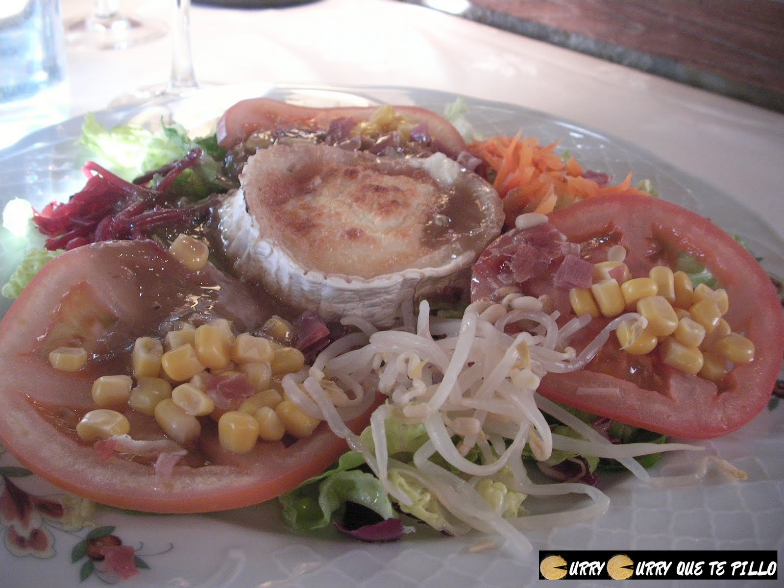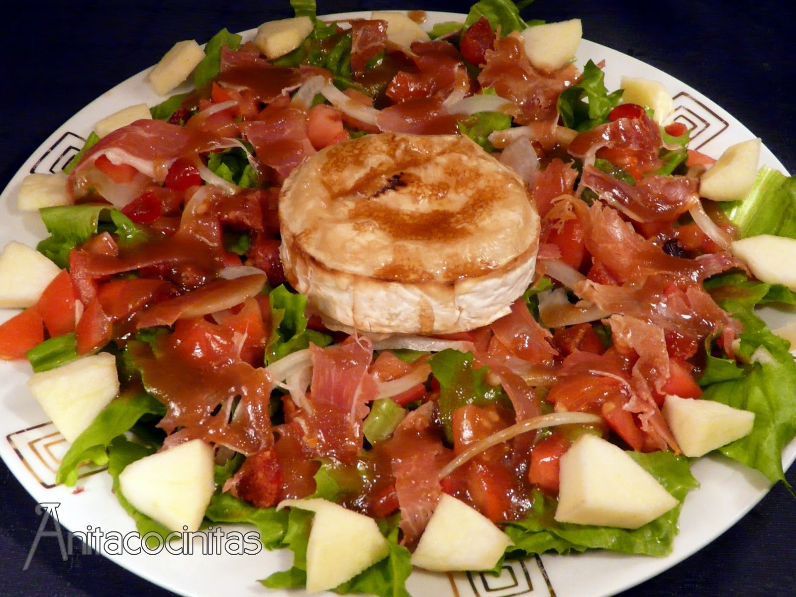 Ingredientes 4 tomates maduros. 4 cucharadas de azúcar. 1 hoja de laurel. 4 dientes de ajo pelados. 1 puñadito de ensalada (que pueden variar según la época del año). 1 cucharada de vinagre de Jerez. 1 rama de tomillo. 4 cucharadas de aceite de oliva virgen extra. sal y pimienta negra recién molida. 8 rodajas de queso de cabra de La Pardina. Preparacion Pelar los tomates. Partirlos por la mitad (verticalmente) y vaciarlos totalmente de semillas y de su agua de vegetación. En un bol poner el tomillo desmenuzado, el laurel también en trocitos, los ajos enteros, el azucar y las 4 cucharadas de aceite de oliva. Mezclarlo todo bien y añadir los medios tomates. Con el horno precalentado a 80 grados, extender los medios tomates en una fuente y cocerlos durante 4 o 5 horas. Para la ensalada poner en un bol los vegetales cortados a mano y bien centrifugados. Aliñar con la vinagreta que habremos preparado con el aceite de oliva, el vinagre de Jerez, la sal y la pimienta bien batidos y reservar. Cortar las rodajas del queso de cabra, colocarlas en una bandeja que aguante el calor y gratinarlas en el grill del horno o en la salamandra. PRESENTACIÓN: Colocar en el fondo de los platos, el tomate confitado (2 por comensal) tibio, aliñarlos con una pizca de sal y pimienta recién molida y unas gotas de aceite. Encima de cada mitad de tomate, colocar una porción de queso de cabra (gratinado y bien caliente), y por último colocar encima y de una manera agradable la ensalada ya aliñada. Servir enseguida. Las ensaladas pueden enriquecerse con algún tipo de fruta, frutos secos, etc. A la escarola le va muy bien los granos de granada y en la época de Navidades así es tradicional en muchas casas del Pirineo. By JOSS Receta de Aragón