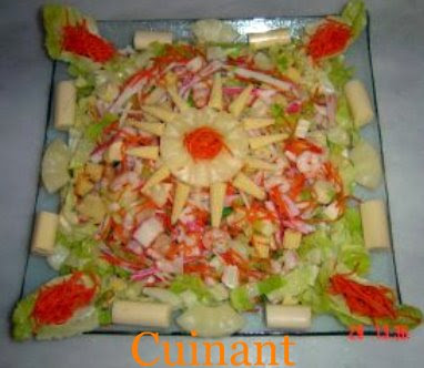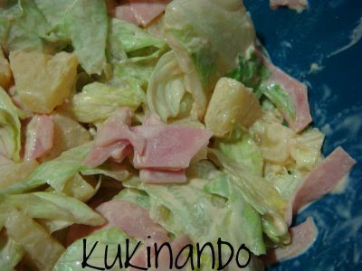 Ingredientes 20 langostinos cocidos 1 lechuga 1 bote de piña en almibar 1 bote de mango en almibar 1 aguacate 1 manzana 1 bote de salsa rosa Preparacion Pelar y trocear los langostinos, aguacate, mango, piña y manzana y ponerlo en un bol. Añadir la salsa (rebajarla con un poco de agua primero) y mezclar todo bien. Lavar la lechuga y cortar en juliana (en tiras), para cubrir toda la base de una ensaladera. Ponemos la mezcla hecha anteriormente sobre la lechuga, dejando que sobresalga lechuga por el borde como decoración.