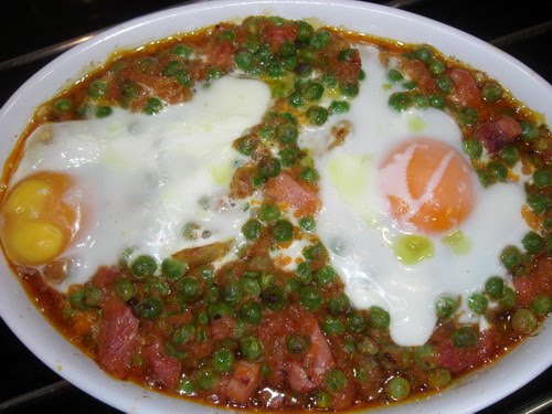 Ingredientes 4 huevos. 4 lonchas de jamón serrano. Un pimiento rojo asado y pelado o 2 pimientos del piquillo. 4 cucharadas de aceite de oliva virgen. 40 gramos de queso rallado. Sal. Preparacion Preparamos 4 cazuelitas de barro pequeñas de las denominadas de ración. En el fondo de estas cazuelitas colocamos unas tiras de pimiento rojo, una cucharada de aceite de oliva y unas tiras de jamón serrano. Encima del pimiento y del jamón cascamos el huevo. Sobre el huevo crudo espolvoreamos un poco de queso rallado. Introducimos estas cazuelitas a 200 grados en el horno durante 10 minutos. Debemos sacar del horno cuando la clara esté cuajada pero la yema liquida. Sacaremos la cazuelita con ayuda de un guante para el horno o un trapo de cocina y servimos la cazuelita sobre un plato para llevar a la mesa. By JOSS Los huevos son alimentos ricos en proteínas de alto valor biológico presentes en su clara, y en grasa saturada, vitaminas liposolubles y colesterol que se encuentran en la yema. En esta receta los huevos se cocinan en el horno por lo que su contenido graso no va a verse incrementado, y se acompañan de tomate y pimiento que aportan al plato vitaminas, minerales y sustancias antioxidantes. El plato se completa con jamón serrano, fuente de proteínas de alto valor biológico, y queso, que contiene proteínas y grasa además de diferentes minerales como el calcio.