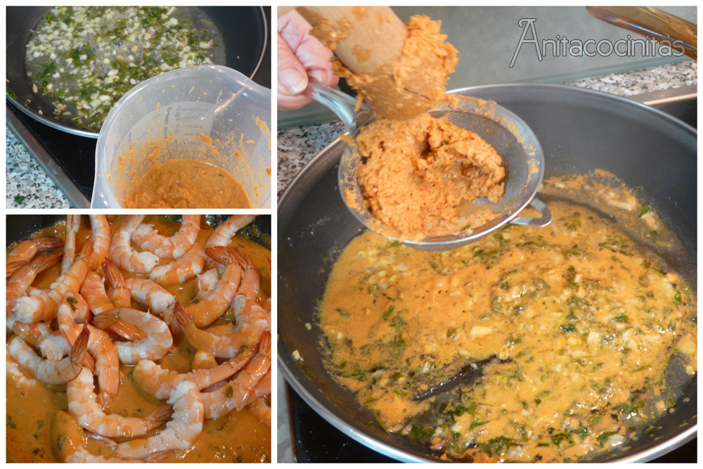 Quitar la cabeza y las patas a las colas, dejar la cascara en las colas, quitarle el intestino y darles un corte por el lomo, golpearlas ligeramente por el corte, tratar de hacer con cada cola un rollito, que se puede haciéndole un corte en la parte mas gruesa y pasar por él la punta de la cola, también se puede utilizar un palillo para sujetarlas.