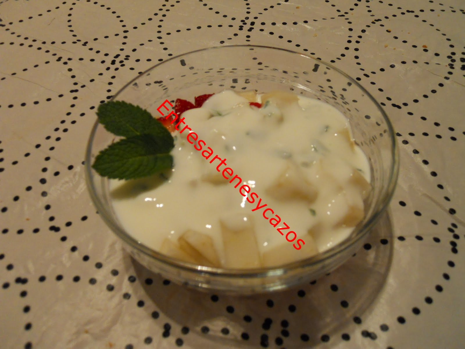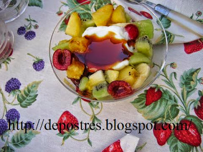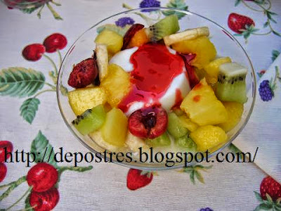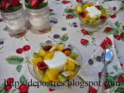 Ingredientes 2 peras. 2 manzanas. 2 plátanos. 2 mandarinas o naranjas pequeñas. 1/2 limón. 2 yogures naturales o de sabor. 4 cucharadas de azúcar. Preparacion En primer lugar se pelan las frutas. Las peras y las manzanas se cortan en cuadraditos y los plátanos en rodajas. Los gajos de las mandarinas o naranjas pequeñas se cortan por la mitad. Las frutas ya cortadas se mezclan en un bol con un poco de zumo de limón que les da sabor y además evita que se oscurezcan. A continuación se añaden 4 cucharadas de azúcar y se mezcla. Se deja macerar 15 minutos en la nevera. El yogur, natural o de sabores, se distribuye en 4 copas o cuencos. Antes de servir se colocará sobre estos cuencos la macedonia de frutas frescas. By JOSS Las frutas son alimentos ricos en vitaminas, minerales, fibra y sustancias con acción antioxidante muy beneficiosas para la salud. En este caso las frutas se preparan en macedonia y se completan con yogur, que va a aportar al postre proteínas y calcio. Al preparar las frutas de este modo se consigue obtener postres muy atractivos y apetecibles que pueden hacer que los más pequeños o personas que no acostumbren a tomar frutas se animen a consumirlas.