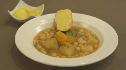 Ingredientes -400gr.de garbanzos remojados -200gr.de judias verdes en trozos -150 gr.de calabaza en trozos -3 peras en trozos -1 cebolla picada -2 tomates maduros pelados y picados. -2 dientes de ajo -15gr.de almendras tostadas y peladas -1 rebanada de pan frito -1 cuchar.de pimentón -1 vaso de caldo de ave -pizca de pimienta negra -1 hoja de laurel -aceite y sal Preparacion Poner en una olla los garbanzos cubiertos de agua con el laurel.Cocerlos 45 minutos a fuego suave.salar a media coccion. En una sarten con aceite,dora la cebolla y añade el pimenton y el tomate.Sofrie unos minutos. En un mortero,machaca los ajos con el pan y las almendras.Añade el vaso de caldo al mortero y mezcla. Agrega las judias,las peras y la pimienta a la olla.Deja 45 minutos a fuego suave. Vierte el sofrito y el majado del mortero a la olla y cuece 40 minutos más si el agua de tu zona tiene mucha cal ,añade una pizca de bicarbonato para que los garbanzos se cuezan bien.
