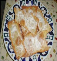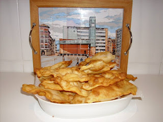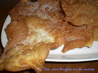 Ingredientes Cantidades para 1 huevo, aumentar en la misma proporción: - 1 huevo - 1 cucharada aceite frito - 2 cucharadas azúcar - un poco levadura - harina - anis Preparacion Freir el aceite con una monda de limón y dejarlo enfriar. Batir el huevo, aceite, azúcar, anís y levadura hasta mezclarlo bien. Con dicha mezcla y la harina se hace una masa, amasar y dejarla reposar un poco. Con el rodillo se estira hasta formar una superfici lomás fino posible, se corta y fríe en abuendante aceite. Al Sacarlas de la sartén espolvorear con azúcar.