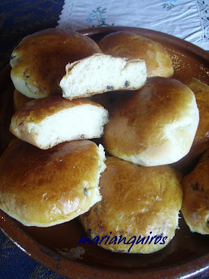 Ingredientes 2 1/2 cucharaditas de levadura seca. 250 ml, de leche 60 grms. de margarina (derretida) 2 cucharadas de azúcar 2 huevos batidos 560 grms de harina de fuerza (se compra en los hornos de pan) 2 cucharaditas de sal. Preparacion Se amasa todo con el programa 1 y, antes de fermentar se saca, se deja reposando 1 hora sobre el radiador y después se hornea durante 30 min a 175 grados. By JOSS Receta Bifinett. Para hacerlo sin panificadora sería del siguiente modo: Esparcir la levadura en un tazón con 100 ml. de leche tibia, dejar durante 5 minutos; revolver para que se disuelva. Calentar el resto de la leche con el azúcar y la margarina, revolver sin parar hasta que la margrina se disuelva. Enfriar hasta entibiar y añadir los huevos batidos, mezclar bien. Mezclar la harina y la sal en un recipiente grande, hacer un hoyo y verter la leche con levadura y la leche con los huevos y mantequilla. Mezclar hasta hacer una masa blanda y pegajosa. Amasar 10 minutos, si hiciera falta añadir más harina hasta conseguir una masa blanda pero no seca. Poner la masa en un recipiente enmantecado/aceitado y dejar leudar tapado en un sitio cálido y resguardado de corrientes de aire entre 1 hora y 1,30 hs., debe doblar el volúmen. Pasado ese tiempo desinflar y volver a dejar en reposo 10 minutos. Dividir la masa en trozos, dar a cada trozo forma de bollo, ir colocando en una bandeja de horno enmantecada o forrada con papel de horno. Dejar reposar 30 minutos tapados con un paño de cocina.(vuelven a doblar el volúmen) Precalentar el horno a 175 grados. Una vez leudados los bollos pincelarlos con una mezcla de leche y azúcar. Hornear 15 minutos, retirarlos del horno y dejar enfriar sobre una rejilla.