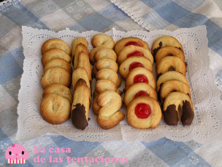 Ingredientes 400 G DE HARINA 240 G DE MANTEQUILLA 140 G. DE AZUCAR GLAS UN HUEVO PARA DECORAR. guindas mermelada chocolate almendras azucar glas Preparación Se mezclan todos los imgredientes bien mezclados y se envuelve en un plastico film,guardanlo en el frigorifico como una hora o mas para que endurezca la masa. Luego en la encimera espolvoreada con harina se estira con el rodillo y se va cortando con corta pastas de distintas formas,algunas les unto yema de huevo batido, poniendolas en la bandeja del horno yo le pongo papel de horno para que no se peguen,y se meten como 8 o 10 minutos,a 180 o 200 grados,depende de cada horno. Cuando las sacas del horno las decoras de distintas formas,chocolate,guindas,almendras picadas como quieras. Las que llevan mermelada dentro la pongo antes de meter al horno y al sacarlas las paso por azucar glas