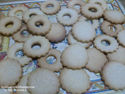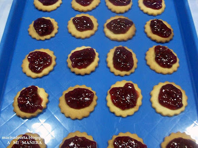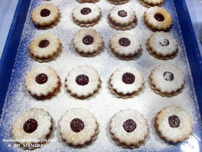 Ingredientes - 150 gr. de harina leudante - 1 pizca de canela - 1 pizca de clavo - 100 gr. de mantequilla - 75 gr. de azucar glass - 1 huevo - mermeladas diversas (yo he puesto de frambuesa, melocoton y naranja amarga) - azuca Preparación tamizar la harina y las especias, cortar la mantequilla en trocitos y frotar con la harina hasta que parezcan migas, añadir el azucar. hacer un hoyo y añadir el huevo un poco batido, mezclar hasta que no tenga grietas la masa. guardar en la nevera 15 minutos. extender la masa finita y cortar redondeles de 4 cm., a la mitad hacerles un agujero en el centro (yo lo he hecho con una boquilla de la manga pastelera). hornear a 180º unos 15 minutos (tienen que estar ligeramente doradas) untar cada redondel entero con mermelada, espolvorear los redondeles con agujero con azucar glass y colocar encima.