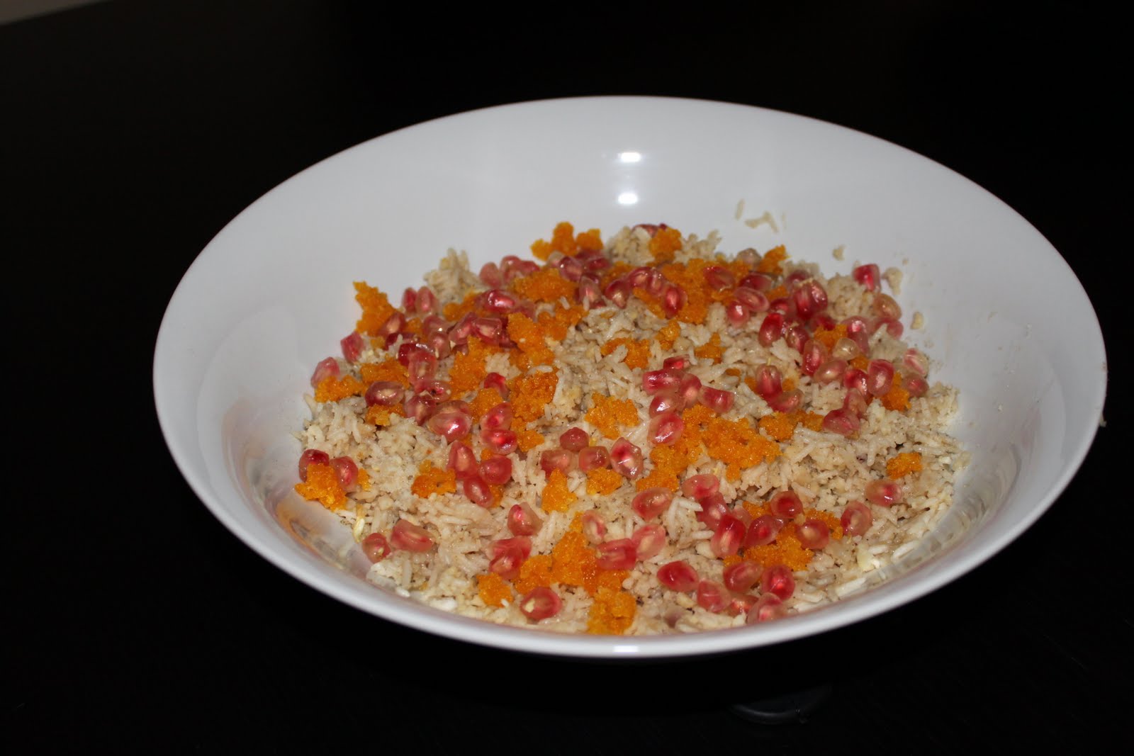 Antes de servir se ahueca el arroz se la añade la corteza de naranja y se mezclan con los piñones y el perejil.