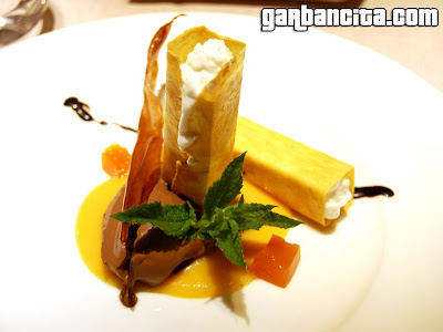 Ingredientes 1 piña mediana, 1/4 l. de pacharán, 1/4 l. de agua, 1 kg. de azúcar. Para la mousse de avellana: 30 grs. de claras de huevo, 30 grs. de azúcar, 1,5 dl. de nata, 50 grs. de avellanas picadas, 25 grs. de pasta de avellana, unas hojas de menta. - Para la salsa: 2 dl. de moscatel, 75 grs. de azúcar, 1 rama de canela. - Para el helado de chufas: 114 kg de chufas, 1/2 l. de leche, 2 dl. de nata, 100 grs. de azúcar, 50 grs. de glucosa. - Decoración: avellanas tostadas y caramelizadas, nueces caramelizadas, hojas de albahaca. Preparacion - Helado de chufas: Tener en remojo las chufas en leche de 18 a 24 horas. Triturarlas con la leche en la que se han remojado, la nata y los azúcares hasta formar una pasta. El mejor resultado lo da la termomix. Si no se tiene, pasar por la turmix. Colar a continuación (mejor con un paño o estameña). Pasar por la mantecadora hasta helar. - Cocción de la piña: descorazonar la piña y pelar su piel. Laminar en sentido vertical, cocerla en el pacharán, agua y azúcar 10 minutos a fuego suave. Reservar en frío. - Mousse de avellana: montar la nata con la avellana picada, la pasta de avellana y la menta fresca picada. Añadir las claras montadas con el azúcar a punto de nieve. Mezclar sin batir, con movimientos envolventes. - Salsa de moscatel y canela: hervir a fuego lento los ingredientes hasta que tome un ligero cuerpo. Dar color con granadina. PRESENTACIÓN: Formar unos rollitos con las láminas de piña. Con ayuda de una manga pastelera rellenarlos con la mousse de avellanas. Disponer un rollito de piña en el centro del plato. Salsear con la salsa de moscatel. Decorar con las avellanas caramelizadas. Colocar una bola de helado en el extremo del plato. Acomodar unas nueces caramelizadas junto al helado. Terminar con una hoja de albahaca. By JOSS Receta de Aragón
