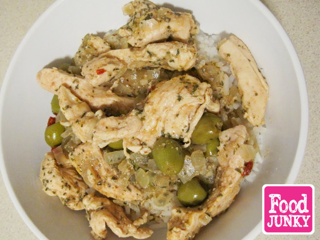 Ingredientes 1 pollo de 1 y 1/2 kg.2 cdas. de aceite de oliva 200 gr. de aceitunas verdes sin carozo2 dientes de ajo, enteros, sin pelar200 gr. de aceitunas negras sin carozo1 cubito de azafrán1 cdta. de jenjibre (en po Preparación