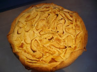 Fría rápidamente la panceta en una sartén. Retire. Derrita la manteca y rehogue en ella la cebolla por 7 minutos. Mezcle la manzana con la cebolla, la crema ácida (con el yogur) y la fresca, huevos, queso, sal y pimienta.