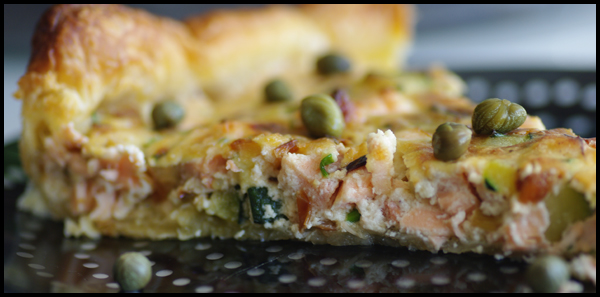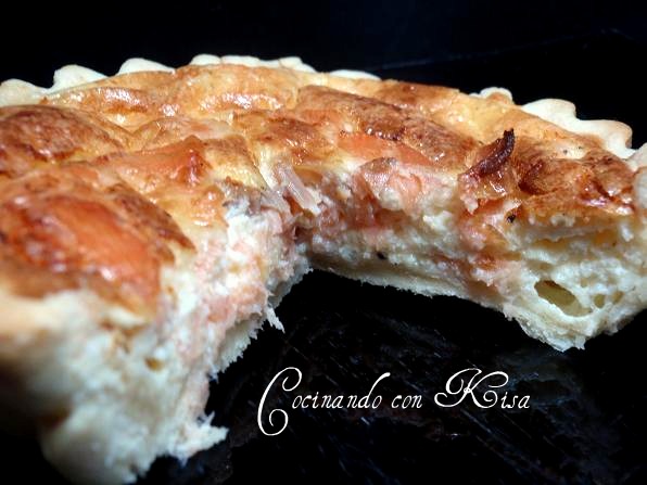 Ingredientes 200 gr. de hojaldre congelado 300 gr. salmón 8 cucharadas grandes de leche 1 huevo 1 yema de huevo Perejil picado Pimienta Sal Preparacion Forrar un molde con el hojaldre y pincharlo con un tenedor. Desmenuzar el salmón, salpimentarlo y colocarlo sobre el hojaldre. Batir el huevo y la yema con la leche y un poco de perejil, y verterlo sobre el pescado. Ponerlo al horno a 190-200 grados una media hora o poco más, según hornos.