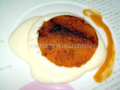 Ingredientes - Para el rulo: 400 gr. de lomos de rape limpios 1 pulpo pequeño (500 gr. aprox.) 1 sobre de gelatina neutra en polvo - Para la espuma: 1 bote de pimientos de piquillo asados de 250 gr. 1 hoja de gelatina Preparacion Rulo: Con un cuchillo bien afilado hacer incisiones longitudinales en el rape para ir extendiendo una capa lo más fina posible. Cortar las patas del pulpo (para que queda más tierno es conveniente congelarlo previamente) Extender papel film de cocina y espolvorear sobre él parte de la gelatina. Poner una capa de rape, a continuación 4 patas de pulpo, luego otra capa de rape y otra de pulpo (en sentido inverso a la capa anterior). Salar y espolvorear con gelatina entre capa y capa. Enrollar apretando bien (nos podemos ayudar de una esterilla de hacer sushi) y atar los dos extremos del rulo formado. Repetir esta operación con dos o tres trozos de papel film para que quede bien firme y lo más estando posible. Cocer el rulo en agua durante 20 minutos. Sacar, escurrir y dejarlo reposar durante, al menos, 12 horas en el frigorífico. Espuma: Triturar los pimientos del piquillo junto con el líquido del bote. Añadir algo de agua si quedara demasiado espeso. Calentar una parte del puré y disolver la gelatina previamente hidratada en agua fría. Mezclar con el resto del puré. Filtrar y meter en un sifón para espuma de medio litro. Cargar con una carga de gas y dejar reposar. En el momento de servir agitar el sifón. Montaje: Cortar el rulo en medallones finos que dispondremos en el plato alrededor de un poso de espuma. By JOSS Receta de sifón.