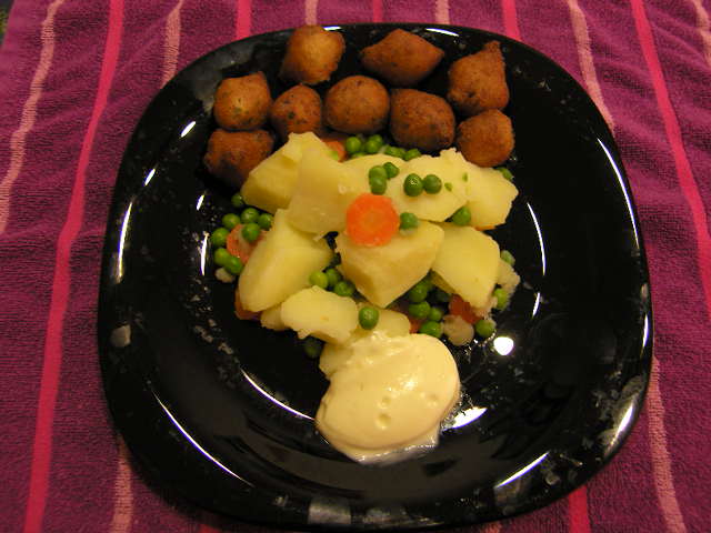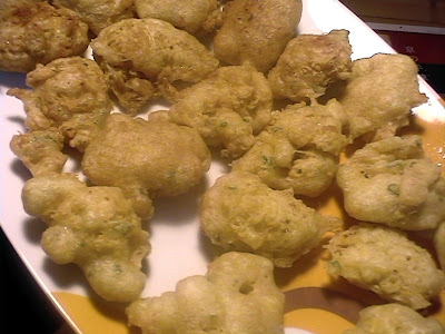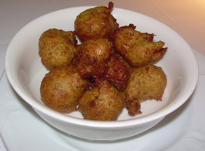 Ingredientes 1 Kg. de brócoli. 1/2 cebolla pequeña. 1 puerro. 2 dientes de ajo. 100 grs. de patata. 500 grs. de fondo de ave. 20 grs. de mantequilla. 100 grs. de aceite de oliva. sal, pimienta y tomillo. - Masa de buñuelo: 80 grs. de bacalao desalado, 250 grs. de leche, 1 patata pequeña, 2 ajos, 1 guindilla. - Tempura para rebozar el buñuelo: 180 grs. de harina, 25 cl. de agua, 15 grs. de levadura prensada, sal, azúcar. Preparacion Trocear el brócoli. A continuación pochar las verduras y la patata hasta que tomen un color dorado y mojar con el fondo de ave. Cocer durante 25 minutos, triturar y colar, dejar reducir hasta el punto de tectura deseado. Salpimentar y añadir fuera del fuego la mantequilla cortada a dados. Por otro lado blanquear el bacalao en la leche con la guindilla y los ajos. Cocer la patata en agua, desmigajar el abacalao y mezclar suavemente la patata y la leche con una varilla. Dejar enfríar, hacer unos buñuelos, pasar por la tempura y freír. By JOSS Receta de Aragón