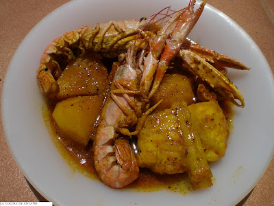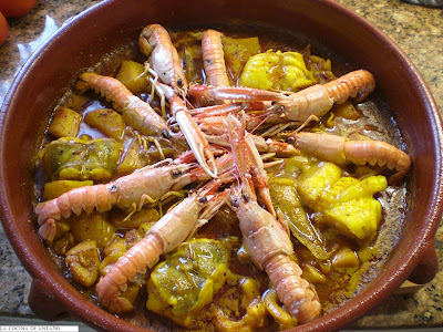 Ingredientes lomo de rape de unos 300 gr. 5-6 cangrejos de mar 8-9 calamares medianos 4-5 patatas 1 cebolleta pimenton dulce pimienta blanca aceite sal Preparacion limpiar los calamares y reservar. cortar el lomo del rape en trozos generos y apartar los huesos para preparar caldo. sofreimos los cangrejos y con un mortero los machacamos. con los huesos del rape y el cangrejos machacado preparamos un caldo de pescado. picamos la cebolleta finamente y la sofreimos, añadimos el rape y los calamares y los sofreimos sin pasarse,añadimos un poco de pimentonm rojo, mientras cortamos las patatas en trozos y las freimos en aceite sin llegar a estar fritas del todo que queden blandas. Añadimos el caldo de pescado pasandolo por un colador a la cazuela donde tenemos el rape y los calamares los dejamos unos 10 minutos en hervor y rectificamos de sal y pimienta al gusto,luego añadimos las patatas remover para mezclar los sabores dejamos unos 5-7 minutos y listo.
