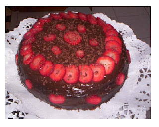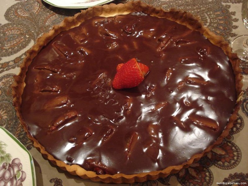 Ingredientes 500 gr. de fresas del mismo tamaño mas o menos 4 cucharadas soperas de mermelada de fresas 200 gr. de chocolate negro 125 gr. de azucar moreno 135 gr. de mantequilla 4 huevos 50 gr. de harina 60 cl. de nata doble Preparacion se enciende el horno para que se vaya calentando. se pone el chocolate en trozos en un cazo al baño maria. se le añaden dos cucharadas de agua y se remueve, hasta que se funda. una vez fundido el chocolate, se le añade el azucar y se disuelve bien. a continuacion, se retira del fuego y se le agregan 125 gr. de mantequilla en trozos, las yemas de huevo, de una en una, y la harina tamizada. se trabaja bien esta mezcla hasta que quede homogenea. se baten las claras a punto de nieve bien firme y se añaden con delicadeza a la mezcla anterior. se unta de mantequilla un molde redondo y se vierte dentro la mezcla anterior. se mete al horno caliente, a 150, durante 35 minutos. transcurrido este tiempo, se desmolda y se deja enfriar. se aclaran bien las fresas y se secan. se les quitan los rabos y se cortan en dos. se reservan unas pocas para decorar el pastel. se monta en un bol 50 cl. de nata con 50 gr. de azucar. se mezcla la mitad con la mermelada de fresas. el resto de la nata se pone en una manga pastelera con boquilla rizada. se corta el bizcocho en dos discos iguales y se coloca el disco inferior en un plato. se cubre generosamente la mezcla a base de nata y mermelada. se reparten las medias fresas por encima y se coloca el otro disco encima, con mucho cuidado. se mete la nata montada en una manga pastelera y se decora la superficie del pastel. se reparten las fresas enteras sobre las rosetas de nata y se sirve el pastel bien frio.