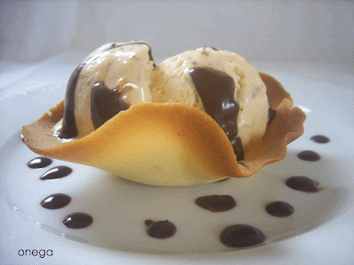 Si al sacar del horno estamos preparadas dejándolas sobre su Sylpat y su bandeja de aluminio, y somos dos a la tarea pues podemos curvar todas ellas antes que se enfríen. Y si a algún principiante algunas tejas quedasen planas, tranquilo, son igualmente ricas.
