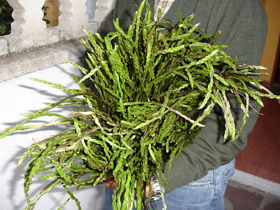 Ingredientes Huevos: 2 Espárragos trigueros: Una docena Agua: 400 cc. sin más. Sal: A gusto, no nos demos disgustos. Leche: Un chorrín. Ajos: Cuatro dientes. Aceite: Dos cucharadas. Preparacion Lo primero que hacemos es preparar los espárragos trigueros. Es conveniente puntualizar que son trigueros, esos que son verdes que te quiero verdes. Los blancos ni son espárragos ni son nada, son un híbrido más raro que una rana cantando rap. La preparación de los espárragos, trigueros, se hace de la siguiente manera: Se coge uno a uno y se le quita la parte trasera del espárrago, como tres dedos, en otros son más de tres dedos, depende de la calidad de los mismos, de los espárragos, no de los dedos. Una vez cortados se lavan bien. Luego pelamos los ajos y los rebanamos como se rebanan los productos que se cortan así con un cuchillo: chuí, chuí, chuí, chuí. En la olla a presión atómica ya tenemos los 400 cc. calentándose; echamos los ajos rebanados, luego los espárragos bien lavados y peinados; es conveniente asear bien a todos los productos. Cerramos la olla y cuando bufe de lo lindo, cinco minutos de cocción a fuego lentoooooo. Ahora la tortilla, o lo que será una ídem. Los dos huevos los batimos bien, echamos la leche, sí, el chorrín de leche, batimos más, echamos un poco de perejil, vale, sí, no lo he puesto en los ingredientes, pero no lo voy a poner yo todo, algo tendrás que poner tú de tu parte. Los espárragos ya están, pues sácalos que se van a asfixiar de estar ahí metidos tanto rato. Los sacamos, y con la ayuda de un tenedor cogiéndolos por la parte de abajo, con las tijeras vamos cortándolos a pedacines y los echamos en el bote o plato donde estén los huevos batidos. Uno, otro, otro y así hasta los doce. Podremos observar fácilmente que no hay por qué recortar todo el espárrago, la parte trasera sigue siendo dura y no es plan de meterla en la tortilla, es un asco luego estar comiendo esta delicia y andar ahí haciendo cochinadas. Mientras hemos estado haciendo esta operación, ya sí hemos podido preparar la sartén con el aceite; Esperar hasta que el aceite esté bien caliente. Ya está caliente, entonces vertemos la mezcla de los huevos batidos con los espárragos bien cortados. Esperamos un poco, movemos, tal, cual, y al ratillo le damos la vuelta. Receta de la lista de Correo Recetas Cocina