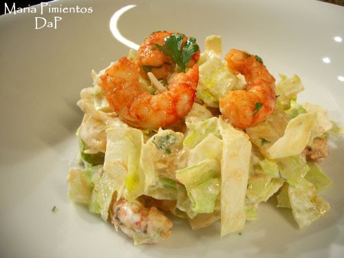 Ingredientes 4 truchas. 80 grs. de gambas peladas. 100 grs. de bacalao desmigado. 2 huevos. 120 grs. de patatas. 2 cucharadas de cebolla picada. 1 manojo de espárragos verdes. Aceite de oliva. Perejil picado. Sal. Pimentón dulce. 2 dientes de ajo. Guindilla. Nata líquida. - Para decorar: pasta brick, tomillo, 1 dl. de crema de trigueros, 1 dl. de salsa de gambas. Preparacion Desalar el bacalao y escurrir. Hacer sudar con un poco de aceite al fuego. Lavar y cocer los espárragos en agua y sal. Freír en aceite, las patatas cortadas como para fritada, agregar a mitad de cocción los ajos cortados a láminas, la cebolla picada y, por ultimo, la guindilla y el pimentón. Sazonar. Incorporar las gambas previamente salteadas y el bacalao escurrido. Acabar con el perejil picado y los espárragos troceados. Limpiar las truchas, abrirlas en dos filetes y dejarlas limpias de espinas. Salpimentar y montar los filetes en un aro previamente engrasado, torrando las paredes del mismo por su interior. Poner el ajoarriero al fuego, incorporar los huevos batidos y cuajar ligeramente, agregar la nata y rellenar las truchas. Cocer al horno unos minutos al vapor o en un poco de vino blanco y caldo de pescado. PRESENTACIÓN: Servir con un cordón de salsa de gambas y otro de crema de trigueros haciendo aguas. Decorar con una teja de tomillo hecha con la pasta brick, aceite y hojas de tomillo. Guarnecer con un espárrago frito. By JOSS Receta de Aragón