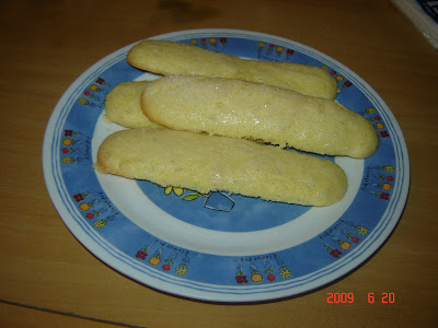 Método: Batir 3 yemas, 3 huevos y 150 gr. de azúcar hasta obtener una preparación esponjosa. Incorporar 150 gr. de harina tamizada, revolviendo con cuchara de madera Agregar 30 gr. de manteca derretida fría, perfumar con 1 cucharadita de esencia de vainilla y mezclar. Poner la preparación en una manga y formar bastones en una placa enmantecada y enharinada. Cocinar 20 minutos en horno moderado.
