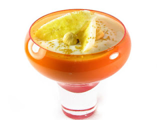 - poner el yogur en un recipiente con fondo y batirlo hasta dejarlo muy fino. - agregar la nata gradualmente, batiendola. - agregue sal y la guindilla roja picada. - pelar los plátanos y cortar en rodajitas, vertirlos en el recipiente del yogur y remover. - servirlo frio y decorado con unas rodajitas de guindilla verde o roja sin semillas.